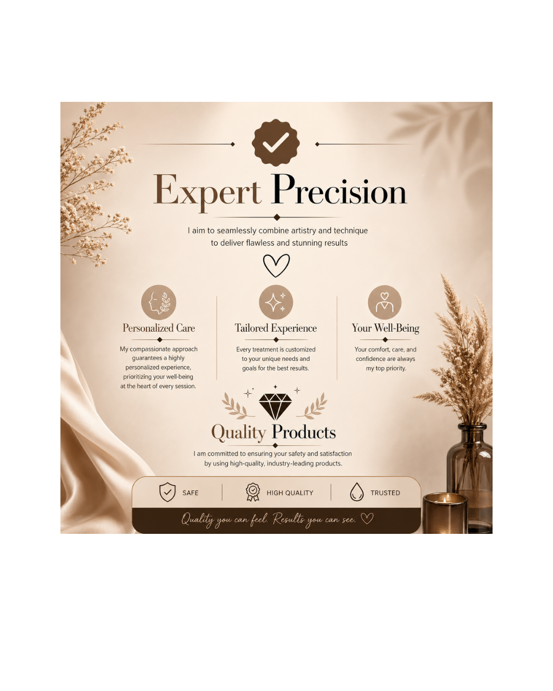 I am committed to ensuring your safety and satisfaction by using high-quality, industry-leading products in my beauty services.